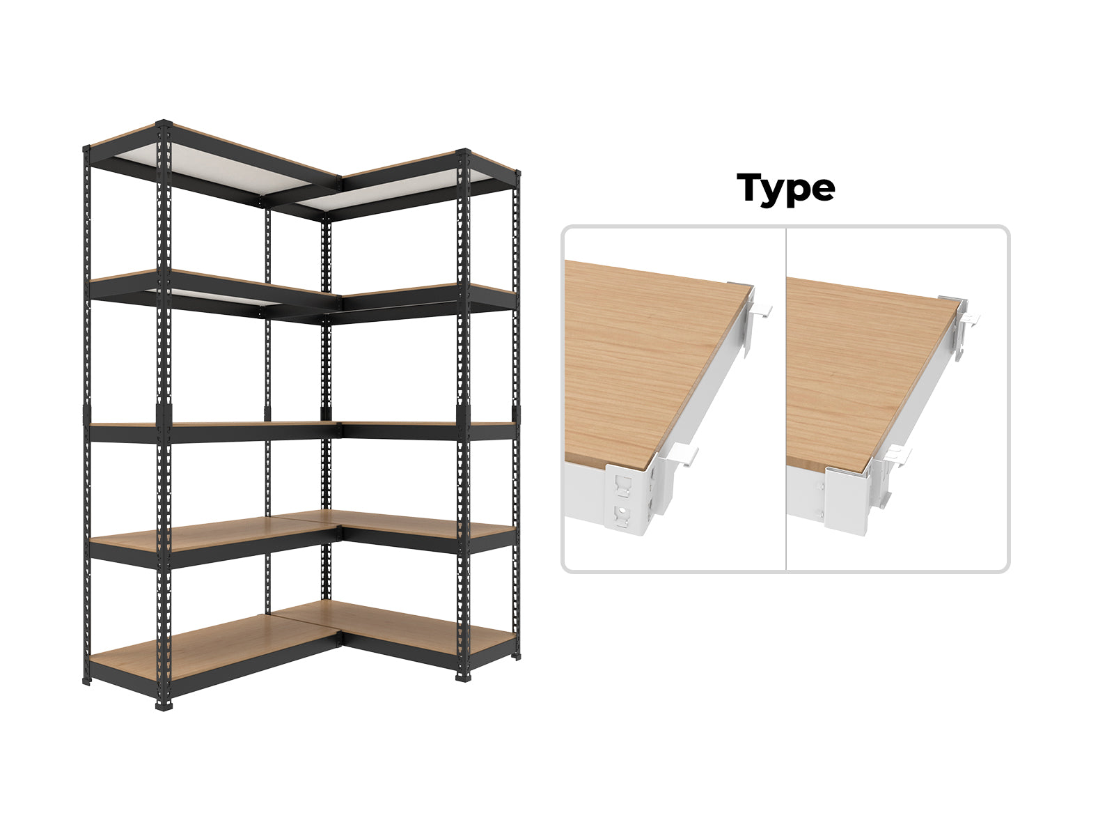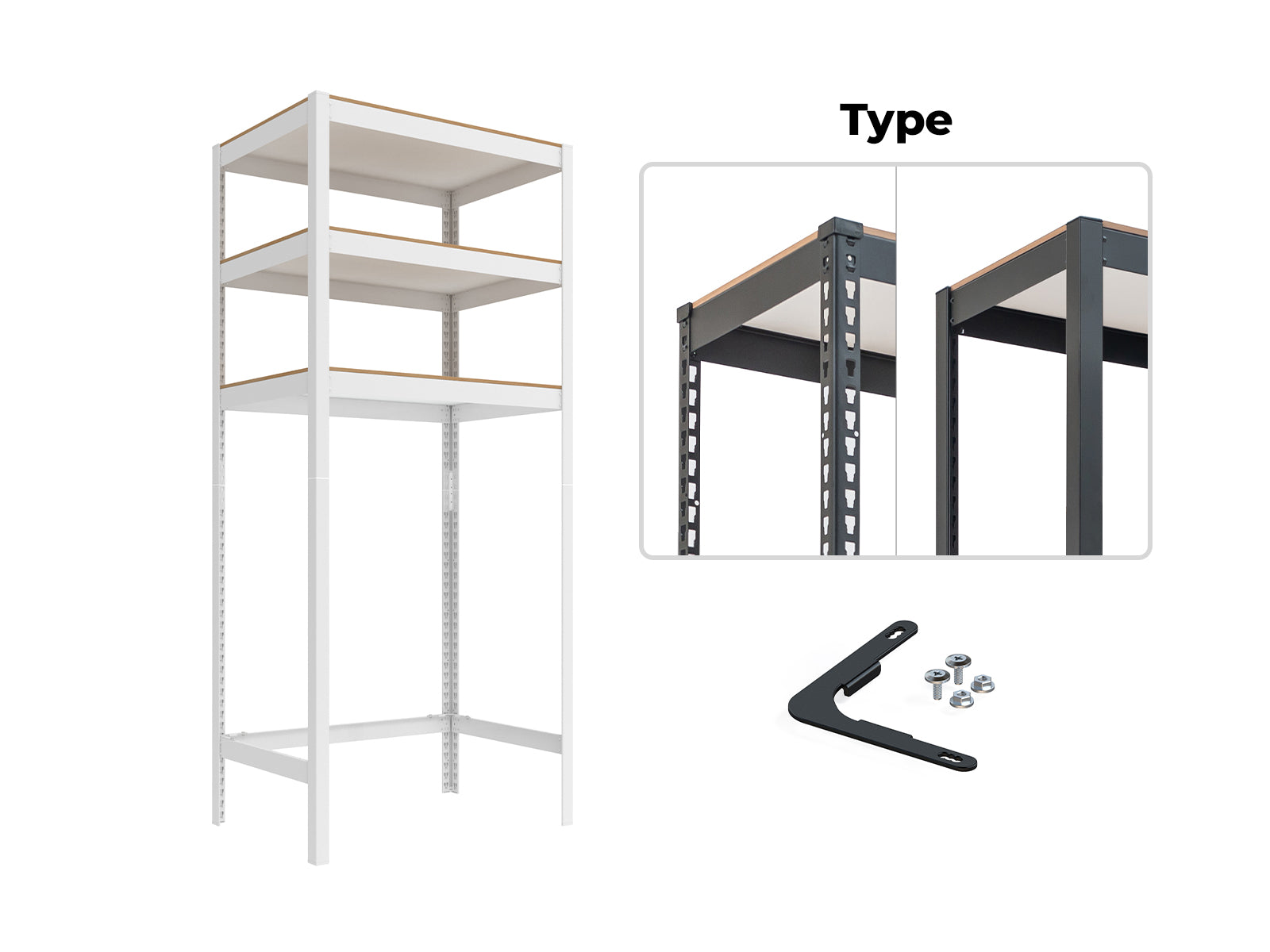 Open-base shelving system that allows floor-level access for larger or frequently handled items. L-type plates provide double fastening for added stability. |