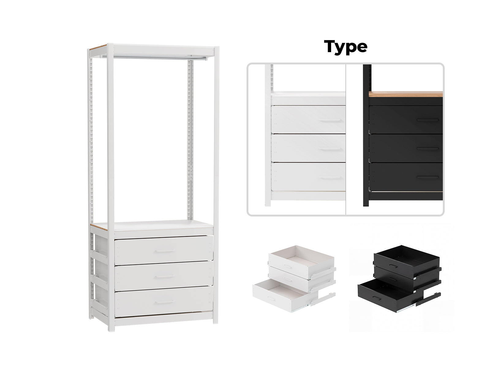 Modular metal shelving featuring detachable drawer units with removable smooth-sliding rails. |
