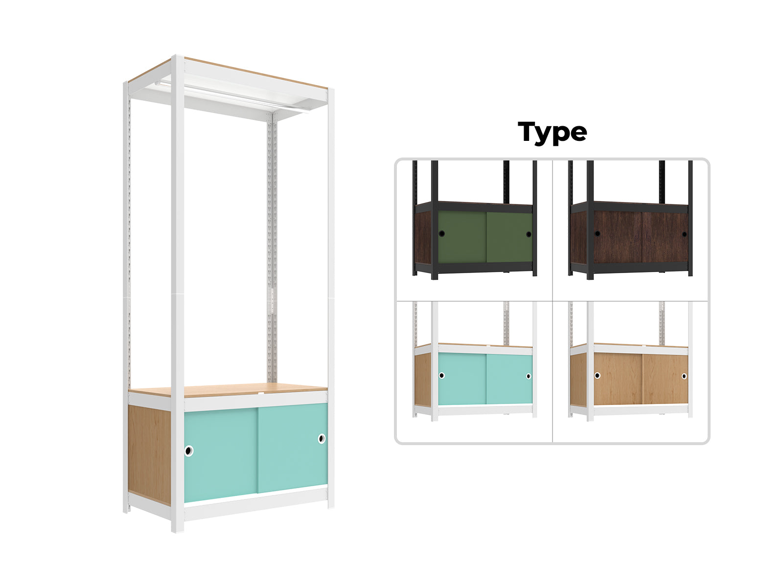 Metal shelving with a cabinet base for concealed, tidy storage. |