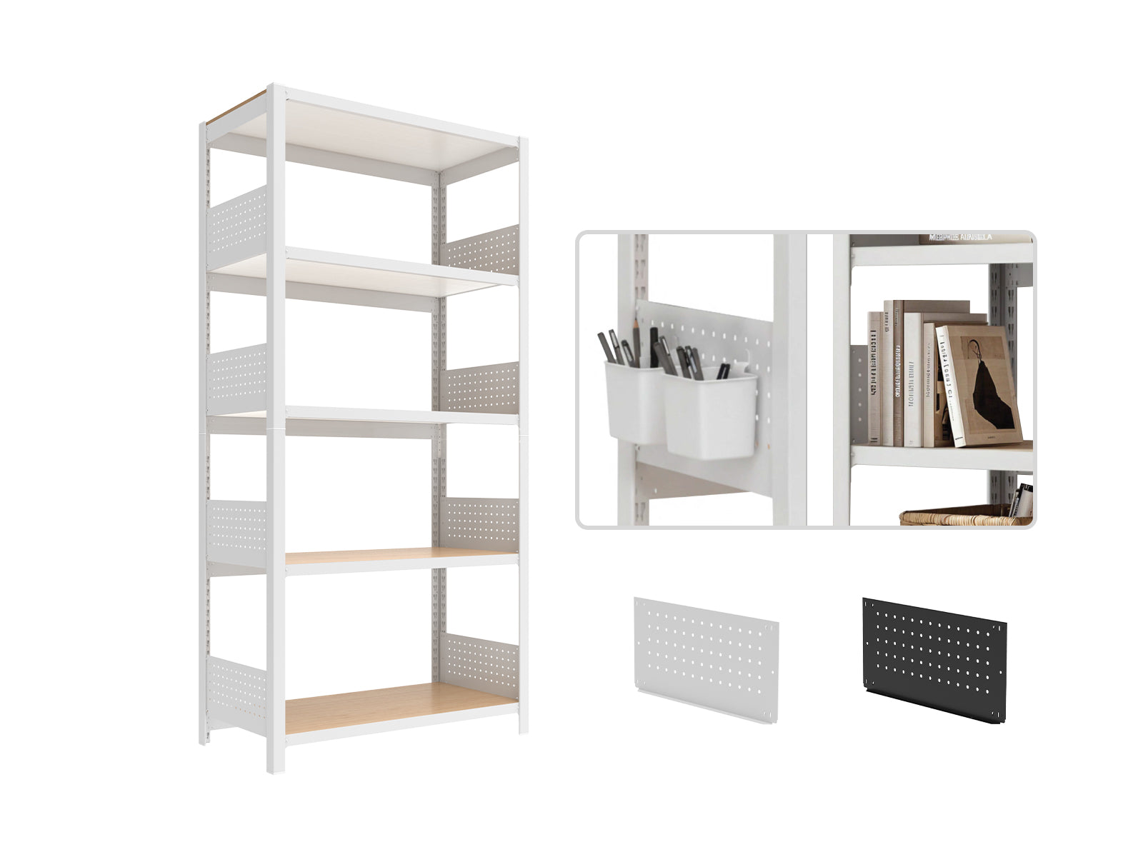 Shelving system with pegboard panels for customizable tool and accessory organization. |